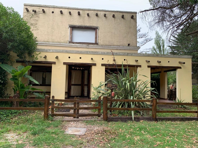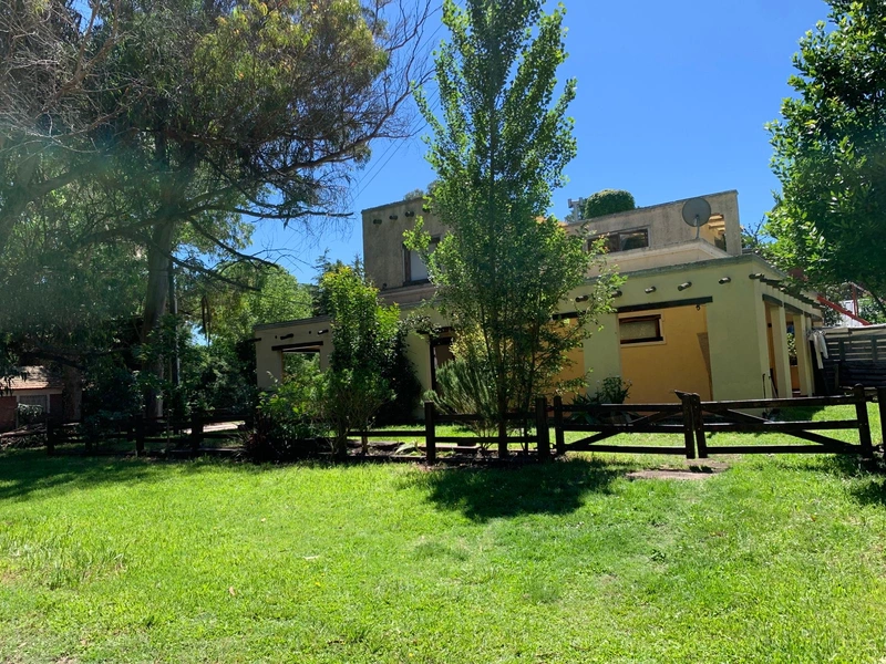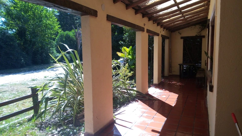 galeria alrededor de la casa. Parrilla. Jardín con plantas y árboles.