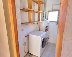 Lavadero con lavarropas y patio con espacio de chulengo y mesa y sillas de jardín para disfrutar una tarde en familia.