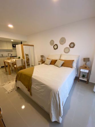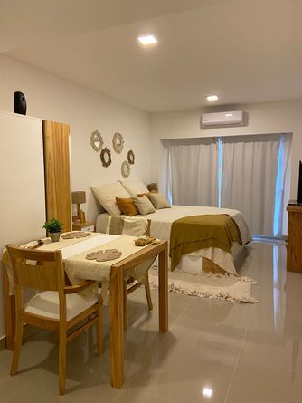 En el apartamento podrás disfrutar de un monoambiente con todas las comodidades, posee cama Queen con ropa de cama incluida de primera calidad, aire acondicionado frio calor, Tv Leed con WIFI en todo el alojamiento, anafe eléctrico y microondas, con pequeña heladera y electrodomésticos como pava eléctrica, tostadora, cafetera para disfrutar de una grata estadía. El baño cuenta con bidet, bañera, secador de cabello, toallas, tallones elementos de aseo.