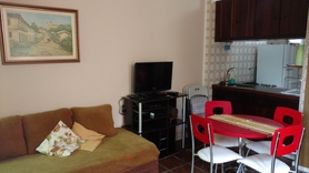 En la sala además de los sofás cama hay una mesa y 8 sillas, así como una TV LCD de 32” con TV por Cable, y una conexión de Internet WiFi con 10Mb.