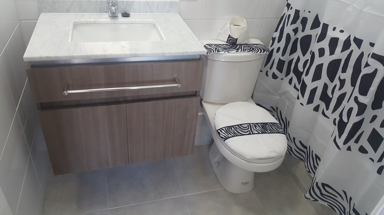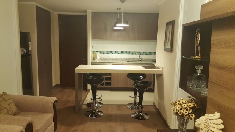 Presenta una cocina de porcelanato full equipada, microondas, jarro eléctrico, loza y cubiertos para cuatro personas, refrigerador, baño con cubierta de mármol y living comedor (todo nuevo).