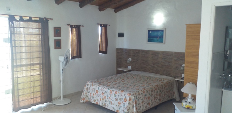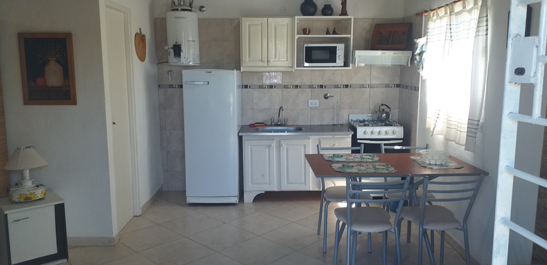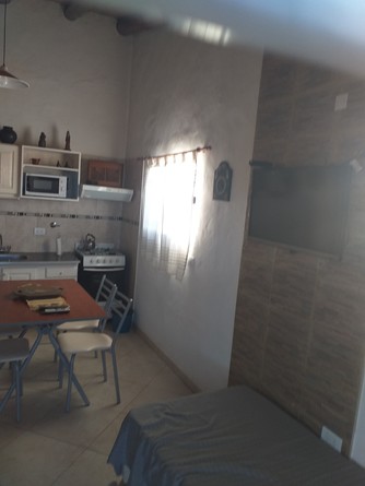 tv 32 pulg. c/cable, microondas, heladera c/congelador, sommier (2 plazas), cama tipo sofa de 1 plaza, ventilador de pie, muy Luminoso y comodo.
