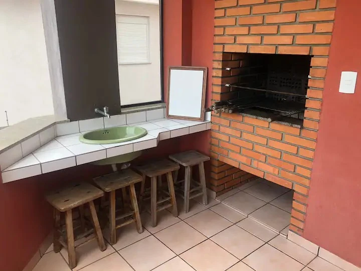 Balcón con parrilla: Cocina y comedor conjugados; Heladera, Micro ondas; Utensilios y vajillas;