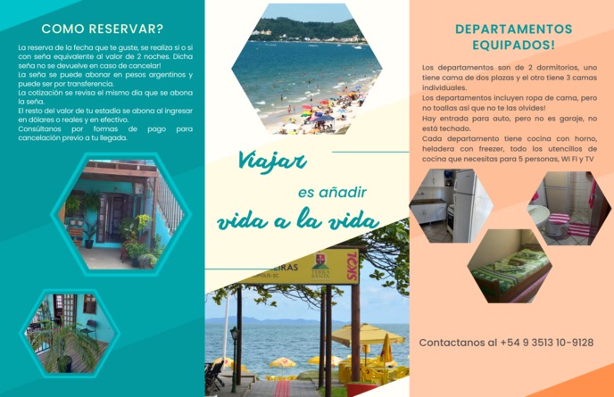 Departamentos completos, de 2 dormitorios ambiente familiar para: hasta 5 personas. Cocina y baños privados. Cocina con horno, heladera, cama de dos plazas, y de una plaza, tv y wifi.