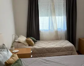 Dormitorio principal: sommier de dos plazas y sommier individual (90 x 1,80 m), amplio placard, TV y ventilador.
