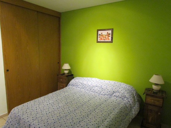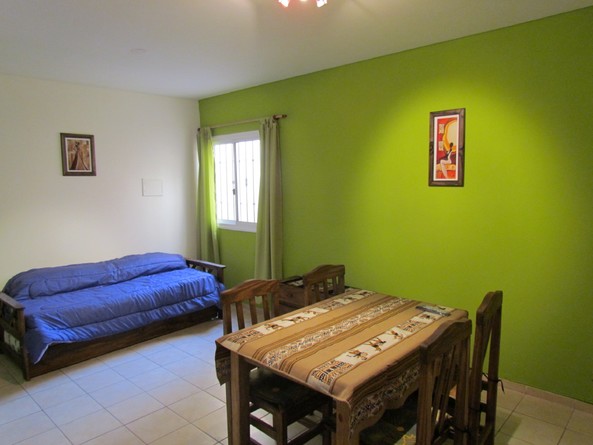 Ubicado en la Alameda, sobre calle San Martín (principal de Mza). Todo tipo de negocios y transporte público cerca. Supermercados tres cuadras, quiosco en frente, farmacia cercana, bares y restaurantes, etc. Cuenta un dormitorio matrimonial con amplio placar y tv led 24", living-comedor con mesa para 4 personas, tv led 32" y sillón cama con carricama, cocina independiente completamente equipada (horno a gas, horno microondas, cafetera eléctrica, jarra eléctrica, vajilla completa, heladera), baño, patio tendedero con lavandería y cochera con portón eléctrico en el mismo edificio. Ambiente familiar y muy seguro. Está en planta baja. Pueden alojarse hasta 4 personas. Wi-fi, tv por cable, calefacción (estufa a gas) y aire acondicionado en living comedor.
