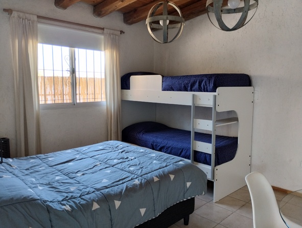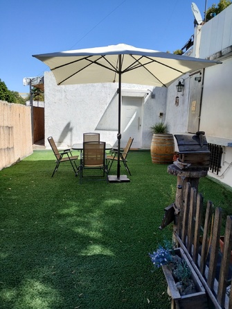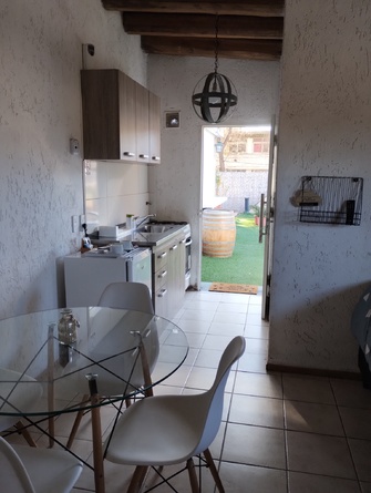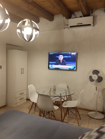Departamento Estudio en barrio centrico de Mendoza Capital. Capacidad maxima 4 personas. Dispone de 1 cama matrimonial y 1 cucheta. Mesa con sillas. Smart Tv 43". Wifi fibra optica gratis. Aire acondicionado (solo frio). Calefaccion. Cocina equipada con horno. Baño completo con agua caliente 24 hs. Terraza con cesped sintetico y juego de jardin para uso exclusivo del huesped. 1er piso por escaleras. Estacionamiento gratuito en la calle. Zona tranquila.
