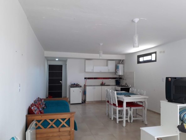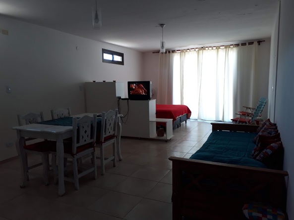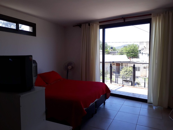 Monoambiente amplio de 50m., Con balcón, capacidad para 4 personas, una cama matrimonial y cama cajón, cuenta con cocina, heladera, batería de cocina. Pileta en quincho.