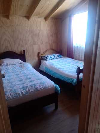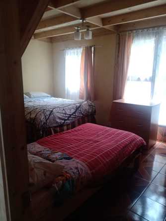 Casa de segundo piso, equipada para 6 personas, cuenta con dos habitaciones, un dormitorio matrimonial grande en el primer piso, un dormitorio en el segundo piso y otro espacio abierto en el segundo piso habilitado con una cama.