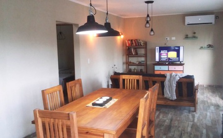 cocina equipada con cocina acero semiindustrial heladera con frezzer microondas.jarra electrica,exprimidor electrico tostadora electrica.vajilla y enseres completo.mesa y sillas (6) futon .tv 40" con directv(proximamente wifi.aire F/C de 4500.estufa a leña.