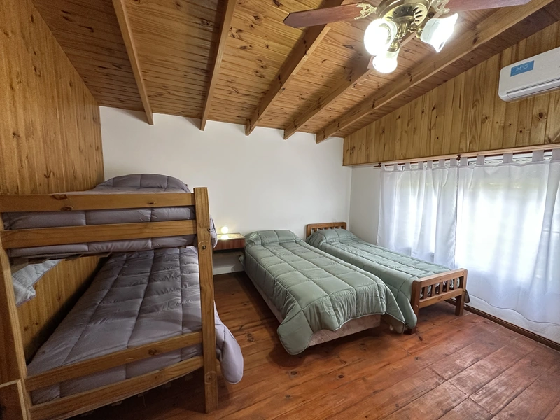 Planta alta: 3 habitaciones con aire acondicionado y ventilador de techo. 2 camas matrimoniales y 4 camas individuales. Acolchados, frazadas y almohadas.