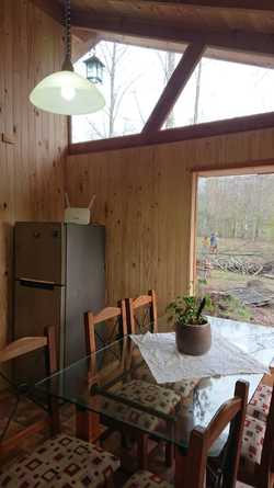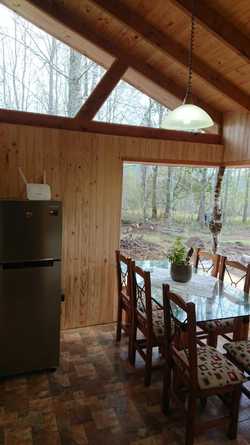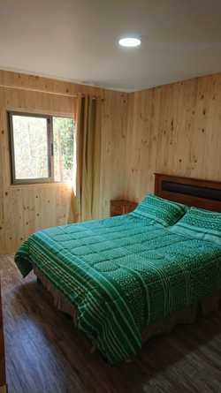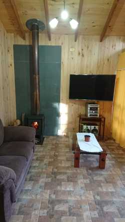 La cabaña se encuentra completamente equipada para 6 personas: cuenta con TV en pantalla plana, canales vía satélite y Netflix, calefón automático, living, comedor, calefacción a combustión lenta con leña incluida (Bosca). El Baño es privado con ducha de agua caliente, incorpora un set de toallas e incluye artículos de aseo gratuitos. Cocina a gas con horno, lavaplatos con agua caliente, utensilios de cocina, tetera, copas y vasos, campana, refrigerador y parilla para asados (no incluye carbón). Sus habitaciones cuentan con cortinaje, closet, veladores, lámpara. En el 1er dormitorio tenemos 1 cama americana de 2 plazas, en el 2do 2 camarotes con 4 camas de 1 plaza y media. La ropa de cama está incluida como cobertor, sabanas, frazadas y almohadas (usted también puede traer si gusta). Adicionalmente hay estacionamiento techado.