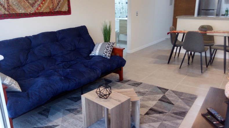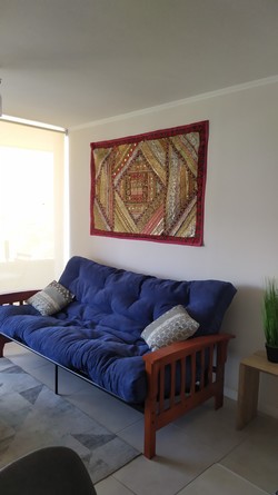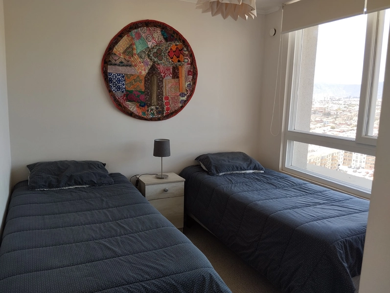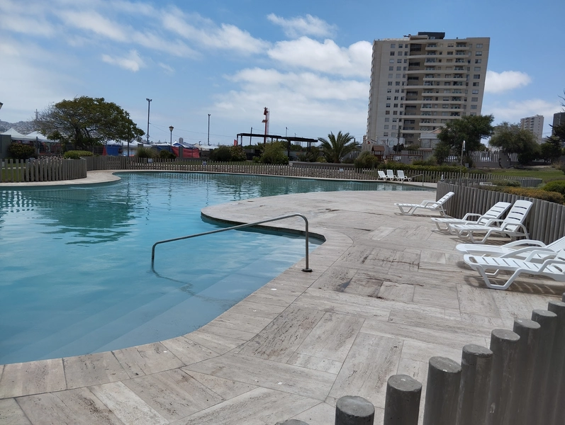 Hermoso departamento en Condominio, con seguridad 24/7, 2d+1b, estacionamiento, terraza con malla de seguridad, equipado para 4 personas, con capacidad para 4, 1 cama matrimonial y 2 camas individuales, TV cable y WIFI. Áreas comunes con jardines, 2 grandes piscinas, gimnasio, sauna, quincho, juegos infantiles y lavandería, cercano a servicios y acceso directo a playa La Herradura
