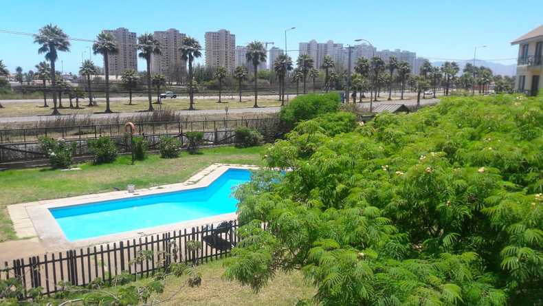 Para 4-5 personas máximo. El departamento cuenta con 2 dormitorios, 1 baño, cocina equipada, quincho, piscina, estacionamiento, conserje 24 hrs.