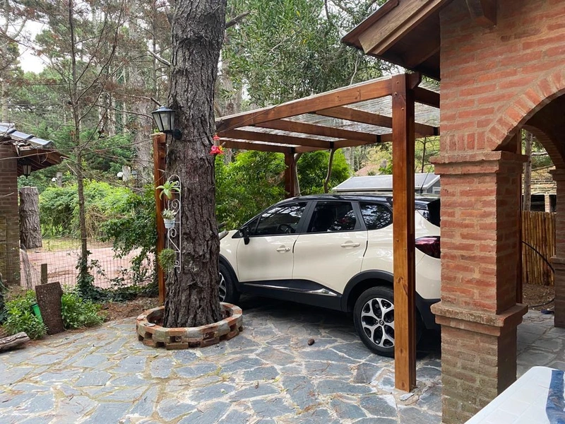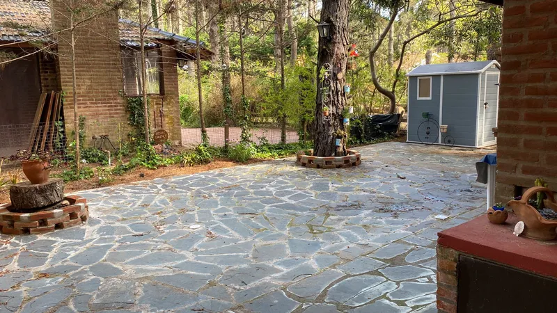 Parrilla en la galería, patio, entrada para autos y sector cubierto al fondo.