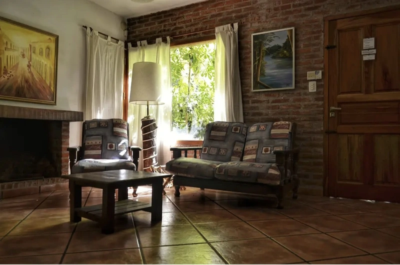 Living con estufa de tiro balanceado, hogar a leños y muebles de algarrobo.