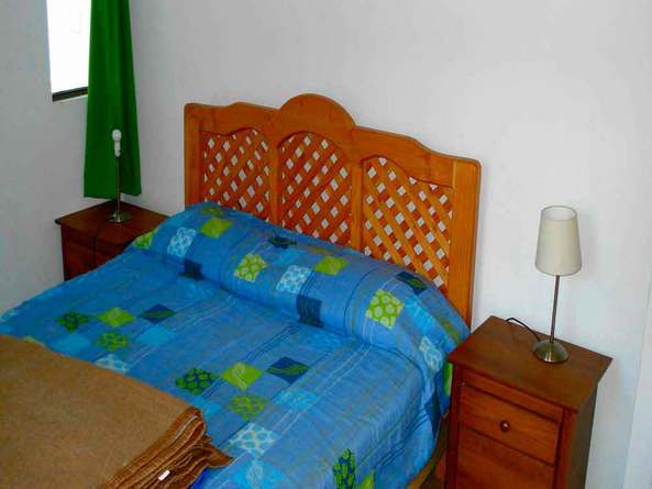 Dormitorio N°1 "Matrimonial": Dormitorio principal se encuentra en el 1° piso al lado del baño. Una cama de 2 plazas con colchón de resortes, tres frazadas, cubrecama, almohadas y televisor".