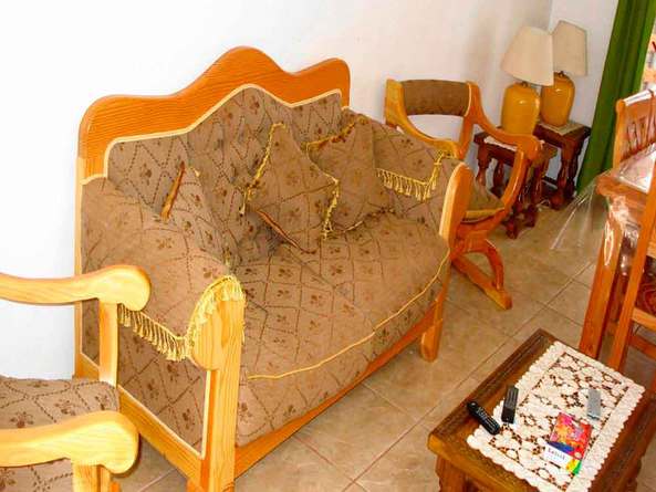 Estar: Juego de living sofá y dos sillones, televisor, DVD, equipo de música, estufa a gas con envase chico de 5kilos.