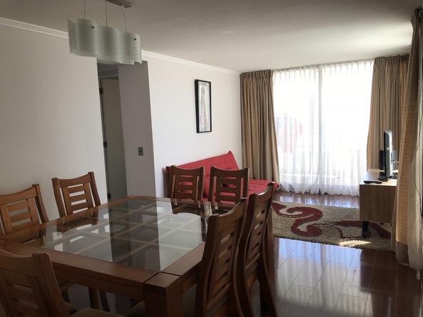 Departamento equipado para 5 personas en Condominio Tadeo Haenke, tres dormitorios, dos baños, estacionamiento, tv cable y wifi. Piso 12 con vista al mar, cerca de supermercados y restaurantes. Desde 45 mil pesos por 4 personas, mínimo 2 noches.