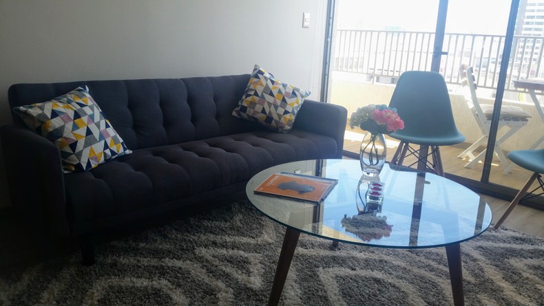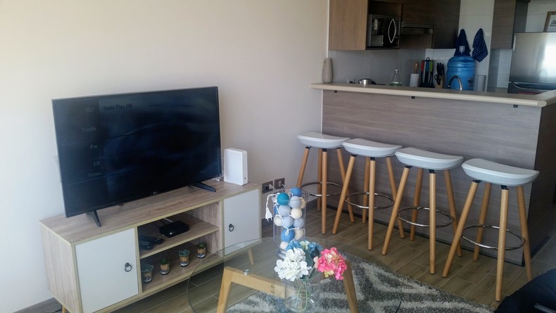 El departamento cuenta con 2 dormitorios (1 en suite) y dos baños, cocina americana, tv cable, wifi, estacionamiento techado, piscina, sala de lavado y secado.