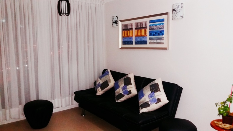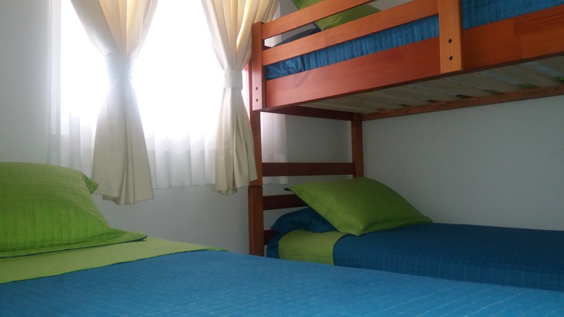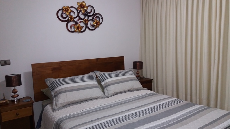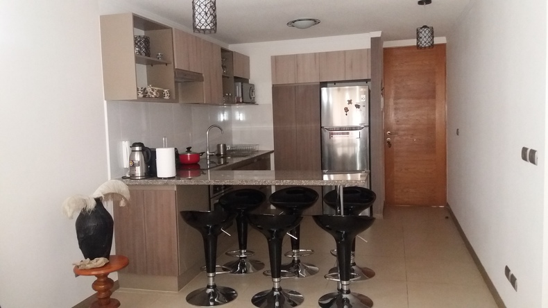 Arriendo hermoso departamento en Condominio Marina Horizonte II (Sector Casino Enjoy Peñuelas) Departamento totalmente equipado hasta para 4 personas, 2 dormitorios ( un dormitorio con cama matrimonial - el segundo con camarote y una cama de plaza y media ), 1 baño, piso porcelanato gres, cocina con cubierta de granito con campana, horno y encimera vitrocerámica eléctrica de 4 platos.