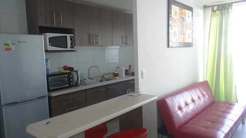 Se arrienda Depto por día en condominio Puerta del Mar, totalmente equipado para cuatro o cinco personas. Los edificios cuentan con 4 piscinas, juegos infantiles, vigilancia 24 horas, accesos controlados y estacionamientos (Dpto. cuenta con estacionamiento privado). A cinco minutos a pie del Mall Puerta del Mar y del centro de La Serena, y a 10 minutos caminando de la playa El Faro.