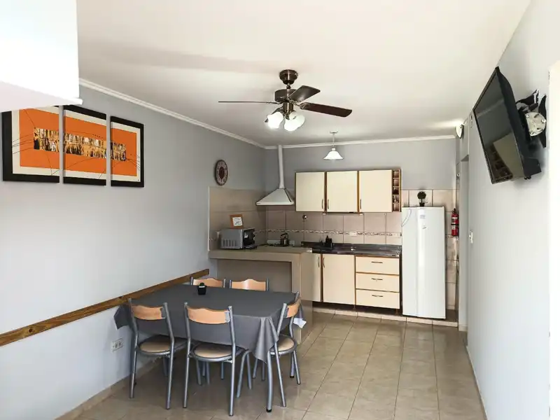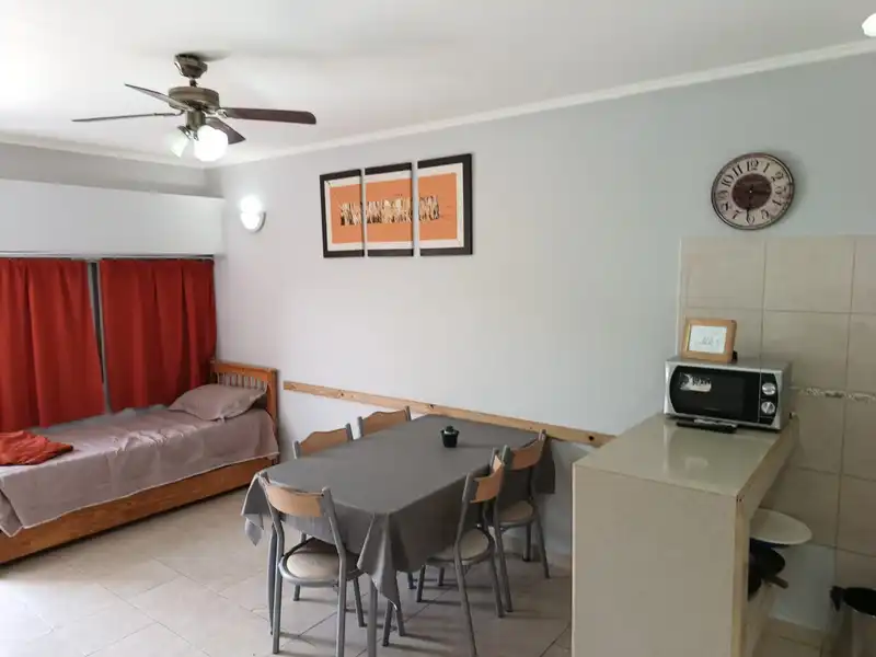 Ubicado en calle Bahía Creek.815 entre las Bajadas de los Acantilados y la Rinconada, a 7 cuadras del mar y a 3 cuadras de "La Anonima" (mayor supermercado del balneario). Características del Departamento: • Cocina-comedor: Con heldera, freezer, microonda, barra,mesa con 5 sillas, TV LCD 32" con DirecTV( Prepago), WiFi,Calefactor de 5000 Calorias y cama Marinera con ropa de cama (ServicioAdicional) (para 2pax). • Habitación Matrimonial: Amplia con somier, escritorio/sillón, ropa de cama (servicio adicional) y aire acondicionado. • Baño: Con bañadera con barral de seguridad
