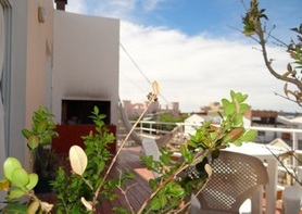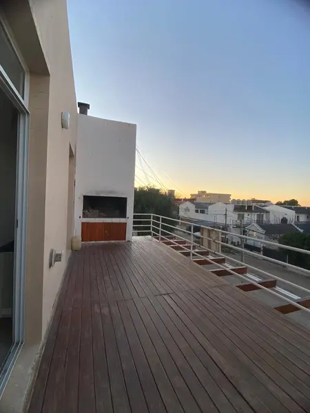Balcón Terraza con Parrilla, hamaca paraguaya y mesa con sillas.
