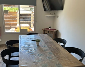 La casa cuenta con dos dormitorios, uno matrimonial con somier y lcd 32" y baño en suite , otra habitación con 2 sommiers de una plaza que pueden usarse separados o, en el caso que sean dos parejas, los podemos unir con un pilow arriba para que quede otro somier de 1,60 mts , segundo baño más chico , en el comedor otro lcd 40" , somier tipo marinera , cocina completa con heladera, microondas , patio individual con parrilla y mesa de madera