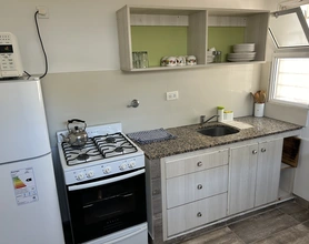 Excelente complejo, cuenta con dos dúplex para 4/5 personas cada uno y una casa para 5/6 personas , los dúplex cuentan el planta alta con dormitorio con somier matrimonial, otra cama de una plaza auxiliar ,ante baño y baño completo , lcd 32" y en planta baja comedor con somier de plaza media tipo marinera lcd 40" cocina cómoda y completa con heladera , microondas , aire acondicionado , patio con parrilla y mesa de madera individual.
