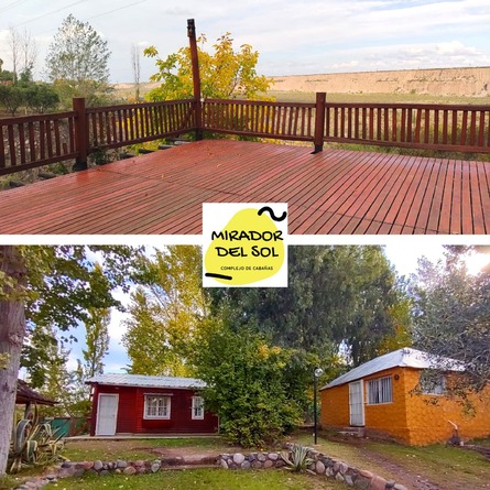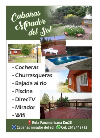 COMPLEJO 3 CABAÑAS AMOBLADAS TOTALMENTE EQUIPADAS, HORNO ELECTRICO, FREEZER, WIFI, COCHERAS TECHADAS, PARRILLAS, TV, DIREC TV, BAJADA AL RIO, PISCINA, TERRAZA VISTA AL RIO. ADEMAS QUINCHO PARA EVENTOS CON TABLONES, SILLAS , PARRILLAS, BAÑOS,  MUSICA PARA HASTA 35 PERSONAS. VISTA A LA MONTAÑA.
