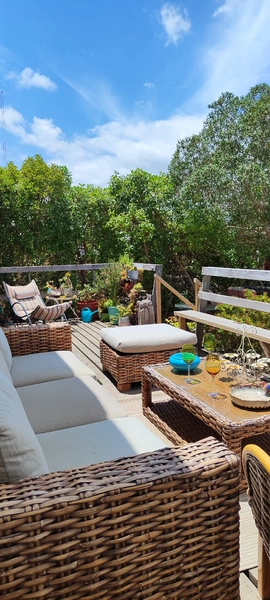 Con capacidad máxima para 8 personas y a unas 7 a 8 cuadras de la playa. Cuenta con piscina con armazon firme , sobre tierra. Lindos y acogedores rincones muy bien decorados.