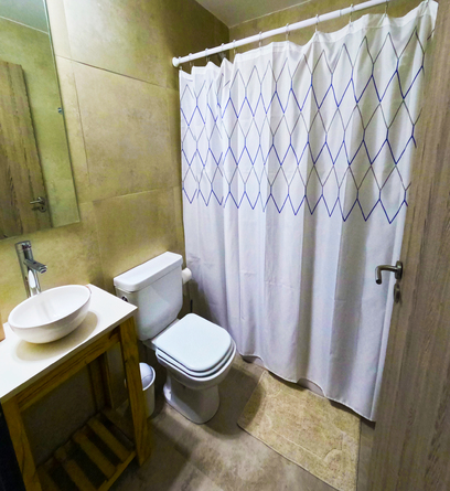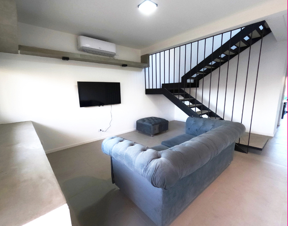 Cuenta con dos dormitorios, cocina amueblada con electrodomésticos, dos baños. Acabados modernos, como pintura lisa, aire acondicionado, tarima flotante, baños con duchas, armarios empotrados vestidos con cajoneras y ventanas con cristales.