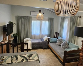 Dos casas, tipo chalet. Una habitación. Living comedor, una cama individual adicional, comodidad para 3 personas. Mismo equipamiento de cocina y parrilla. Aire acondicionado frío calor. Baño completo, que incluyen artículos de higiene. TVs Smart Android, Plataformas propias de Netflix, Prime, Youtube y CotelPlay. Cajas de seguridad, apta Notebooks.