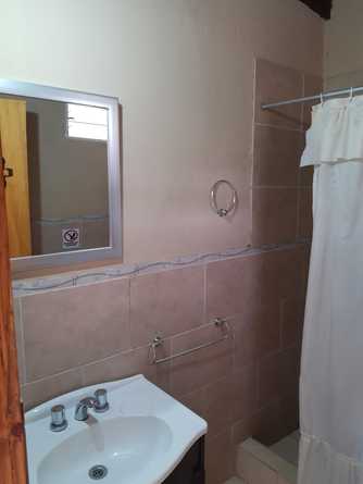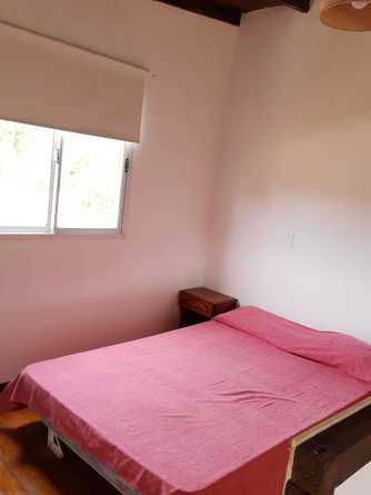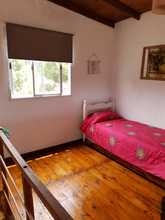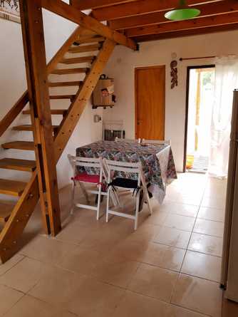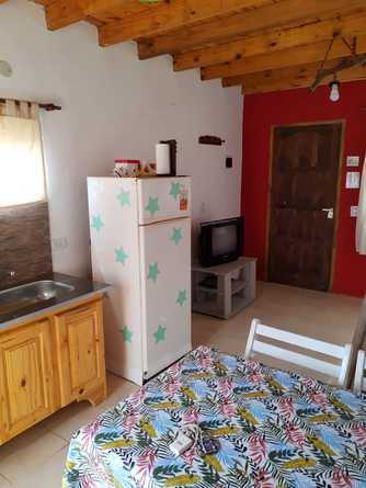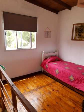 la cabaña esta preparada para recibir a cuatro huéspedes, sus ambientes están divididos en dos plantas, en la planta baja nos encontramos con un living, comedor, cocina integral, y baño completo la cocina esta totalmente equipada, cuenta con una heladera familiar cocina con horno y vajilla completa (platos, vasos, cubiertos, cacerolas cafetera, licuadora, tostadora, etc.). Hay escaleras internas que llevan al primer piso, este es un ambiente amplio que cuenta con una división de un lado esta la cama matrimonial y del otro lado de la división hay una cama individual con un carrito. Es un ambiente muy luminoso y agradable a la vista, transmite tranquilidad.