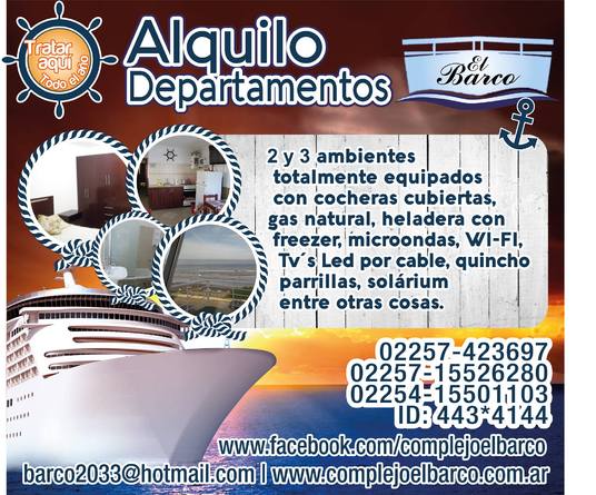 COMPLEJO EL BARCO ALQUILA Dtos de 2 y 3 ambientes muy amlios - Tarifas promociónales se pueden ver en nuestra WEB: www.complejoelbarco.com.ar - dtos de 2 y 3 amb amplios, todas las comodidades, tv x cable, Wi-Fi, cochera cubierta, parque, quincho cerrado, parrillas, miradores solarium vista al mar, alarma de entrada, dtos para hasta 6 personas, estamos en barrio residencial (El Silvio Mar de ajo Sur) - la mejor vista al MAR con amplias playas (tranquilidad y familiar) - También consulte precios x DIA o semana – Abierto Todo el Año CONTACTO: