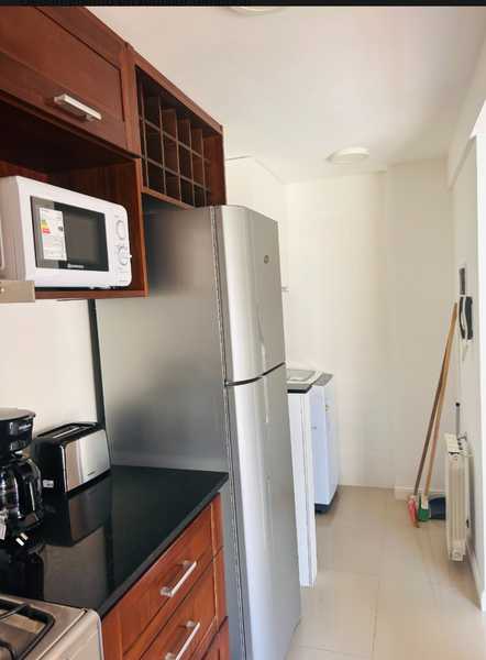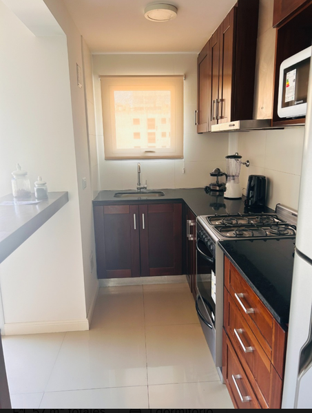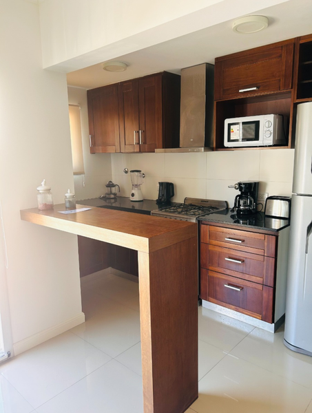 Departamento de 2 ambientes con balcon a la calle, en zona La Perla a una cuadra del mar. Cuenta con habitación con sommier de dos plazas, vestidor y baño completo, toilette de recepción. Living comedor con sofá cama para dos personas, cocina completa con heladera con freezer y microondas. Lavadero con lavarropas automatico.