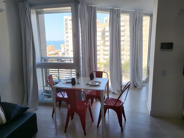 El immueble cuenta con living comedor con sofa cama doble y cocina integrada con equipamiento de primera línea todo eléctrico, espacio separado para dormitorio con cama 2 plazas, baño completo con bañera. Ventanales hasta el piso con vista al mar, calle y plazas. Cochera fija y seguridad 24 hs.