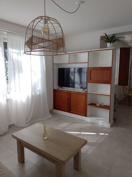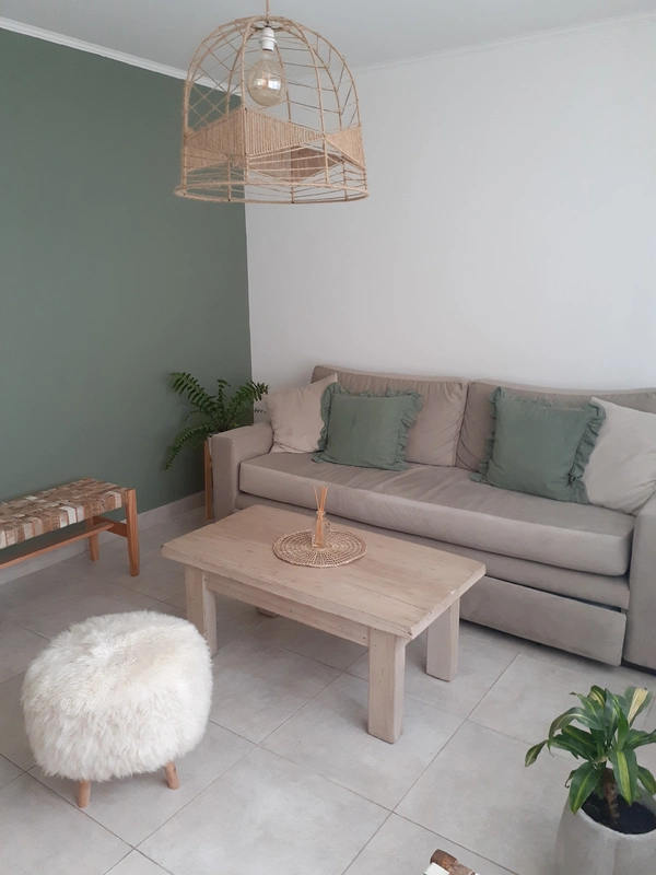 1 dormitorio con cama de dos plazas y sillón cama en living para dos personas.