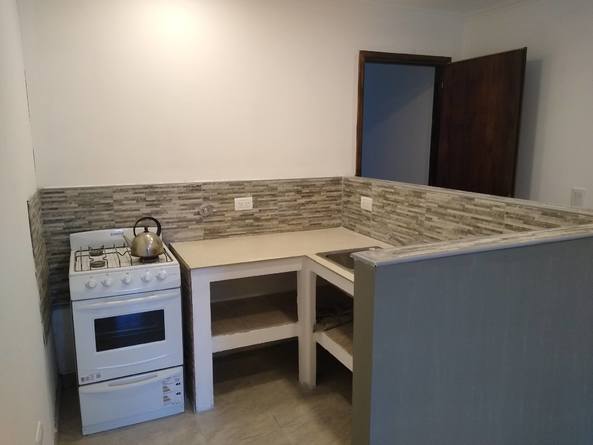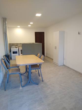 Cuenta con Living-Comedor equipado con sillón diván con carrito (duermen 2 personas), mesa con 4 sillas y Tv color con cable. Cocina integrada, separada con barra, con vajilla completa: heladera con freezer, pava eléctrica, cocina con horno.