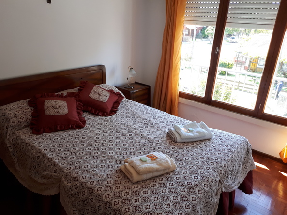 La habitación cuenta con cama matrimonial (incluye ropa de cama) y amplio placard con baulera.