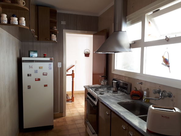 Cocina con horno, heladera, cafetera y tostadora (proveemos de té, café, tostaditas y mermelada para los huéspedes como cortesía de bienvenida).
