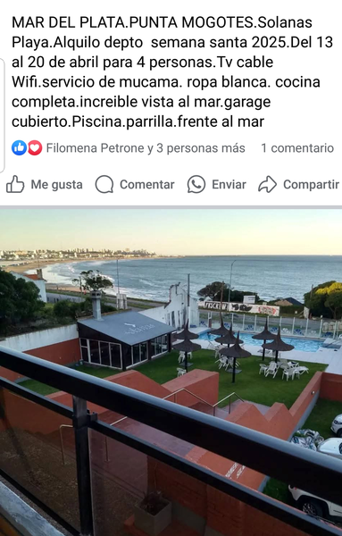 Depto frente al mar para 4 personas.wifi tv cable..servicio de mucama.ropa blanca.cochera cubierta. Pileta parrilla.1 dormitorio.1 baño.cocina completa
