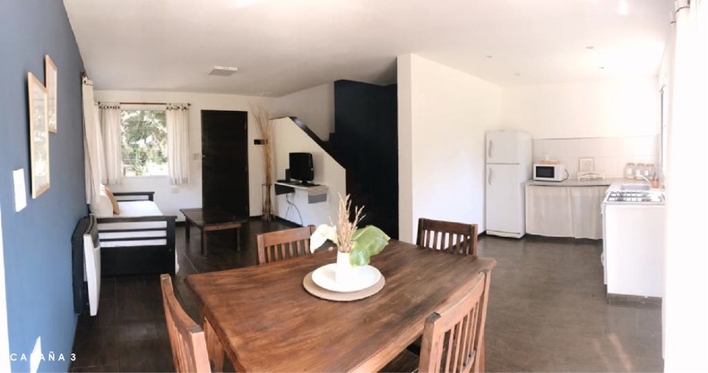 La cabaña 3 tiene capacidad para 4/5 personas y cuenta con living, cocina, comedor y toilette en planta baja, y con 2 habitaciones y baño completo en planta alta. Incluye cochera descubierta, wifi, TV por cable, ropa blanca, cocina totalmente equipada, ventilador, calefacción, gran parque con parrilla y deck.
