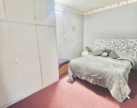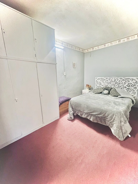 Habitación con cama matrimonial alfombrada con placard y escritorio.