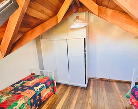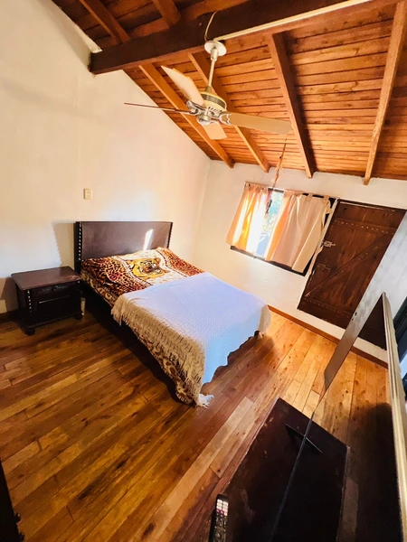 Otra habitación con cama matrimonial y placard, tv con cable. Ventilador.