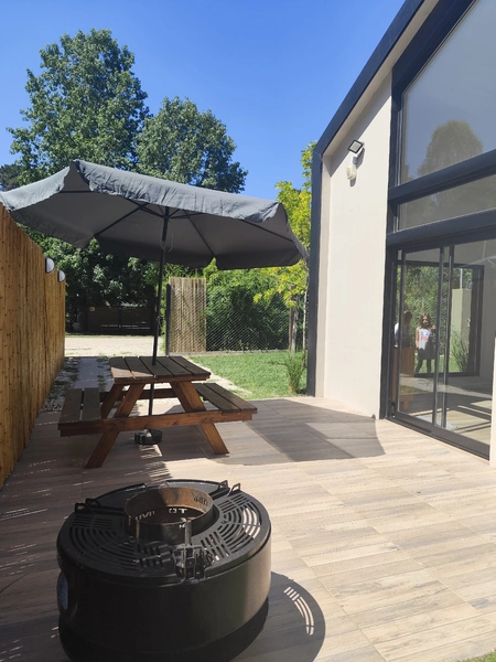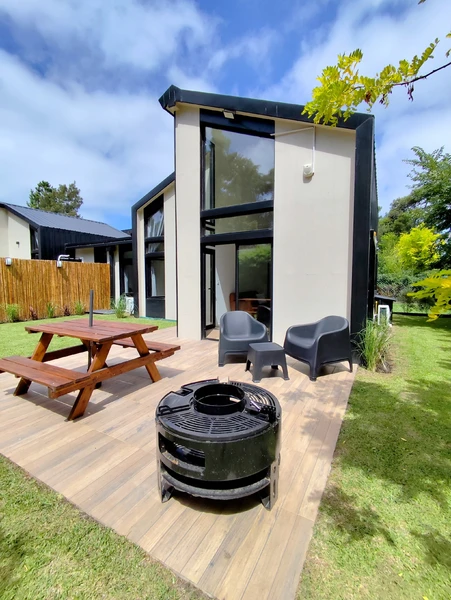 Parque a su alrededor con sillones de jardín, mesa canadiense y sombrilla. Fogonero Tromen