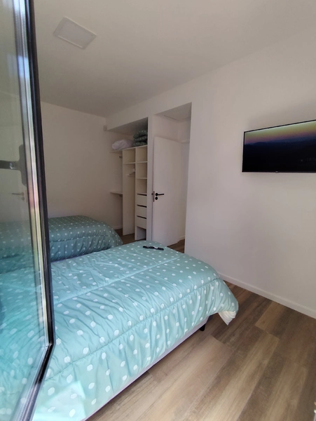 Consta de 3 ambientes, dormitorio principal cama matrimonial, dormitorio secu Darío con 3 camas somier de 0.90. Aire acondicionado y TV plana en sus tres ambientes.
