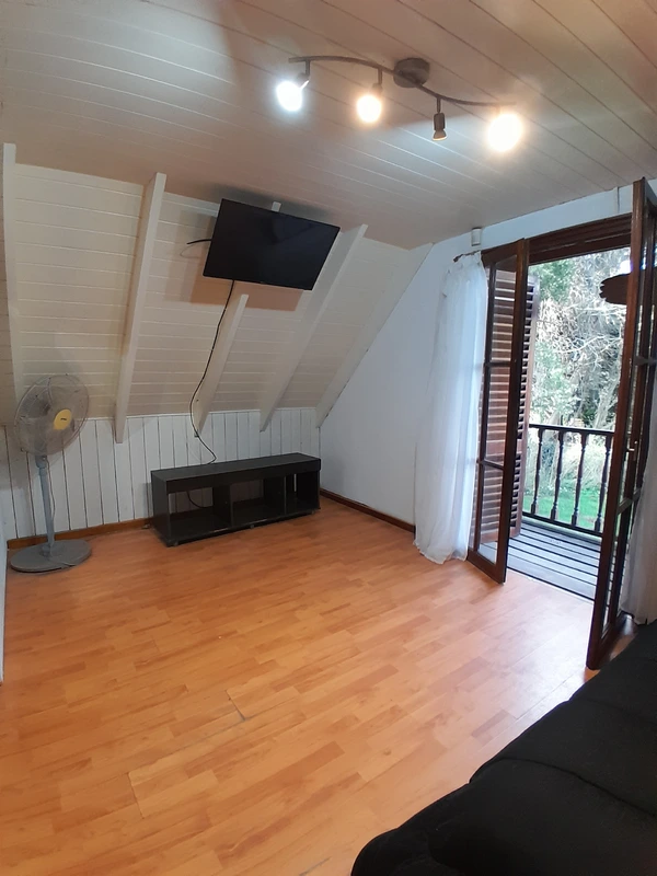 En planta alta hay dos dormitorios y un baño. El dormitorio principal da al frente, cuenta con balcón saliente, una cama matrimonial. El dormitorio que da a la piscina tiene dos sofá cama. En planta baja cuenta con un sofá cama y un futón.