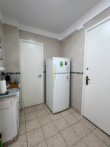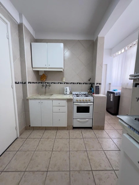 Un living comedor con sillon cama, cocina totalmente equipada con dependencia para espacio de guardado.